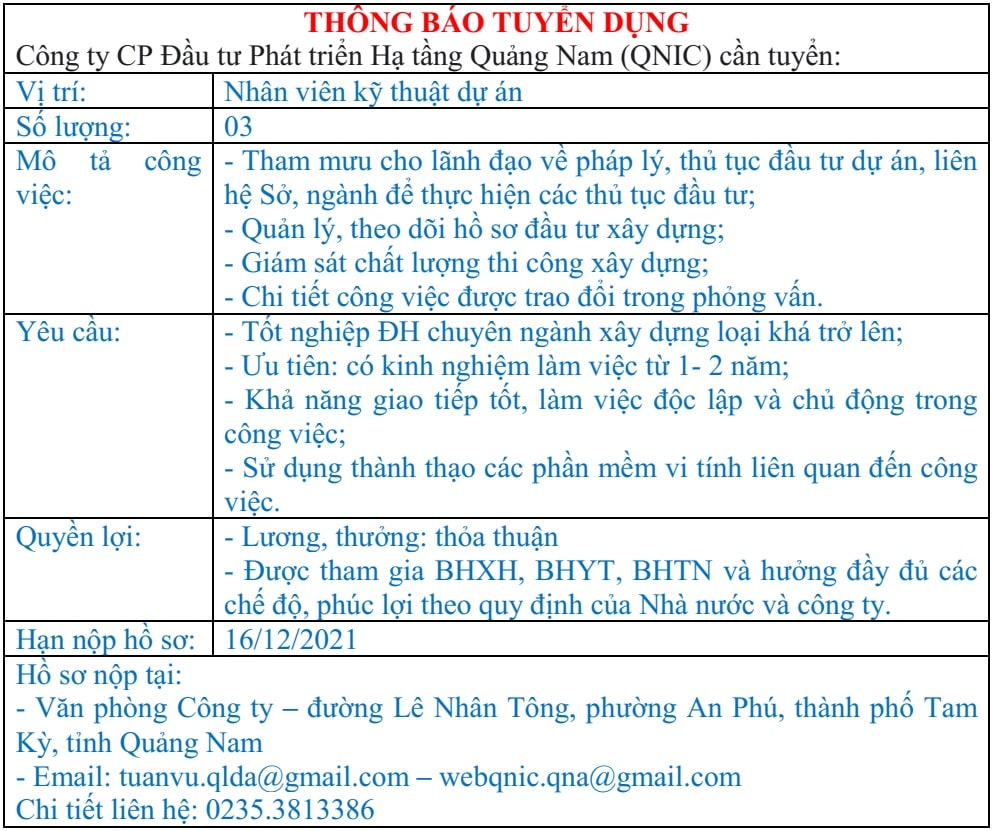 Hoạt động công tyTHÔNG BÁO TUYỂN DỤNG Posted on 16 Tháng mười một, 202116 Tháng mười một, 2021 by admin THÔNG BÁO TUYỂN DỤNG Do nhu cầu mở rộng hoạt động kinh doanh, QNIC cần tuyển 03 nhân viên kỹ thuật dự án. Hạn nộp hồ sơ: 16/12/2021. Chi tiết: